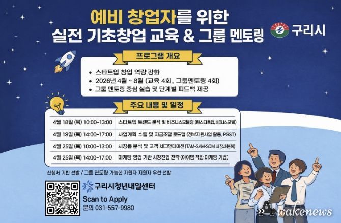 어웨이크뉴스 오경하 기자 | 구리시는 예비 창업자와 창업에 관심 있는 청년을 대상으로 ‘실전 기초창업 교육 & 그룹 멘토링’ 프로그램 참여자를 4월 1일부터 교육 인원 모집 마감시까지 모집한다고 밝혔다.