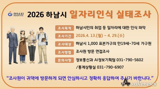 어웨이크뉴스 오경하 기자 | 하남시는 오는 4월 13일부터 29일까지 17일간 ‘2026 하남시 일자리 인식 실태조사’를 실시한다고 밝혔다.