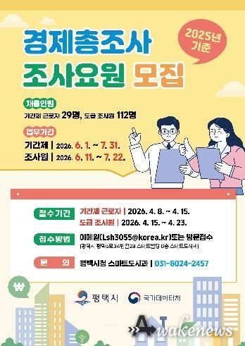 어웨이크뉴스 오경하 기자 | 평택시는 오는 8일부터 23일까지 ‘2025년 기준 경제총조사’ 현장 조사 업무를 담당할 조사요원을 모집한다.