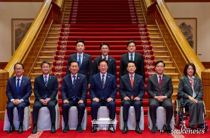 어웨이크뉴스 오경하 기자 | 이재명 대통령이 청와대에서 여야 당 대표 등과 만나 여야정 민생경제협의체 오찬 회담을 했다.
