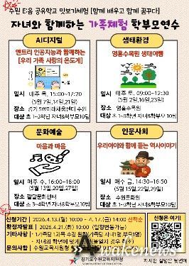 수원교육지원청은 오는 5월 한 달간 관내 초등학생 자녀와 학부모를 대상으로 지역 인프라를 적극 활용한‘2026년 가족체험 학부모연수’인 '공유학교 맛보기 체험:함께 배우고 함께 꿈꾸다'를 운영한다고 밝혔다.
