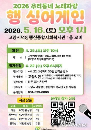 노래자랑은 고양시에 거주하는 시민이라면 누구나 지원이 가능하며 오는 22일까지 온오프라인 중 편한 방법으로 신청하면 된다. 온라인은 관련 링크로 접속해 신청하고 되고, 오프라인은 행신종합사회복지관 2층 사무실에 방문해 신청서류(이름, 주소, 신청곡 등)를 작성·제출하면 된다.