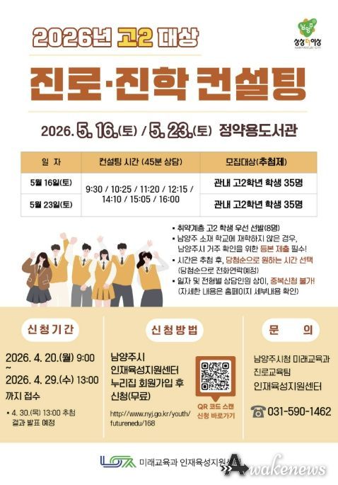 어웨이크뉴스 오경하 기자 | 남양주시는 오는 20일부터 29일 오후 1시까지 관내 고등학교 2학년 학생과 학부모를 대상으로 ‘고2 맞춤형 진로·진학 컨설팅’ 참여자를 모집한다고 15일 밝혔다.