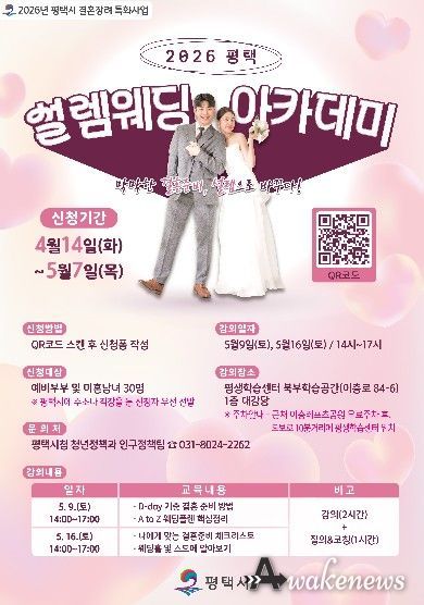 어웨이크뉴스 오경하 기자 | 평택시는 2026년 평택시 결혼 장려 특화사업 ‘2026 평택 설렘웨딩 아카데미’를 오는 5월 9일과 16일에 운영한다고 밝혔다.