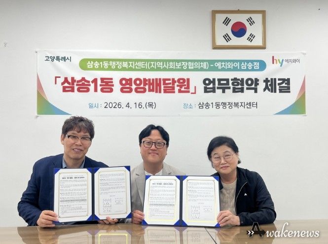 어웨이크뉴스 오경하 기자 | 고양특례시 삼송1동은 지난 16일 취약계층의 건강과 안부를 동시에 살피는 ‘영양배달원’사업 추진을 위해 지역사회보장협의체와 ㈜에치와이 고양 삼송지점이 업무협약을 체결했다.
