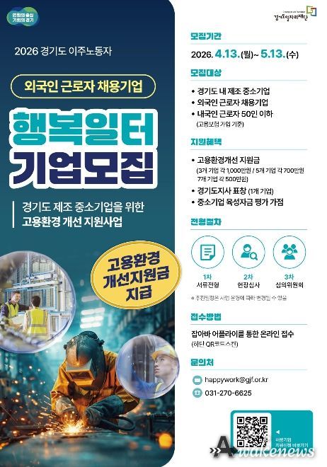 어웨이크뉴스 오경하 기자 | 경기도와 경기도일자리재단은 도내 외국인 근로자를 고용한 중소 제조기업을 대상으로 ‘2026년 경기도 이주노동자 행복일터 선정사업’ 참여기업을 모집한다고 20일 밝혔다.