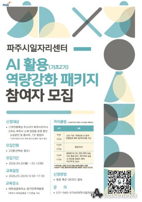 모집 기간은 4월 20일부터 5월 12일까지이며, 교육은 5월 20일 경기인력개발원에서 하루 7시간 과정으로 진행된다. 모집 대상은 파주시 관내 소상공인으로, 총 25명을 선착순 모집한다. 자세한 사항은 파주시청 누리집을 참고하거나 파주시 일자리센터로 문의하면 상세히 안내받을 수 있다.
