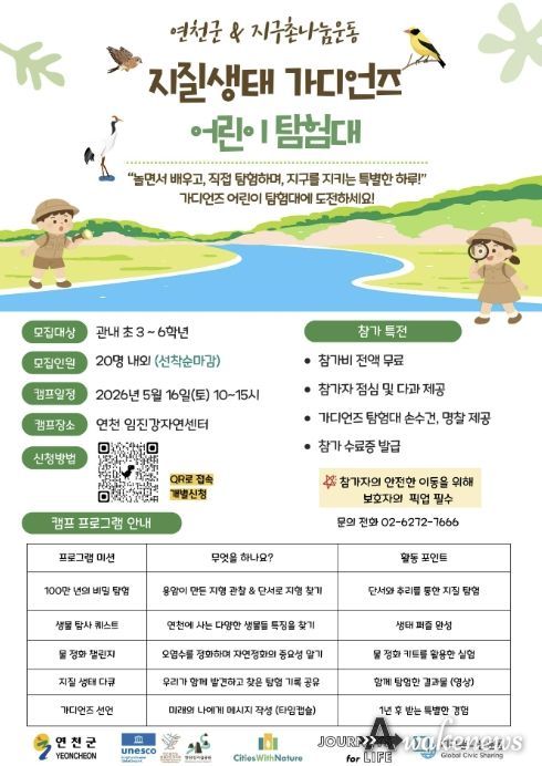 연천군이 주최하고 국제개발협력 NGO 지구촌나눔운동이 주관하는 이번 캠프는 오는 5월 16일 토요일에 진행될 예정이며, 참가 학생들이 연천의 대표적인 지질·생태 자원을 직접 탐사하고 체험하는 과정을 통해 지역의 가치를 이해하고 환경 보전의 중요성을 배울 수 있도록 마련됐다.