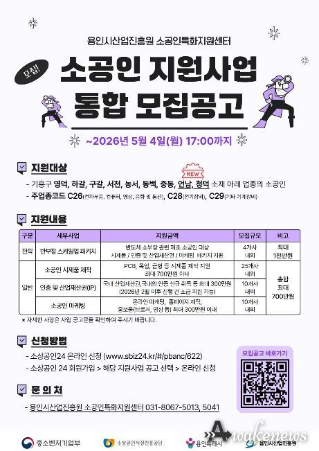 어웨이크뉴스 오경하 기자 | 용인시산업진흥원 소공인특화지원센터는 용인시 소재 소공인의 경쟁력 강화를 위해 소공인 지원사업을 본격 추진하고, 참여기업 총 49개사를 모집한다고 밝혔다.