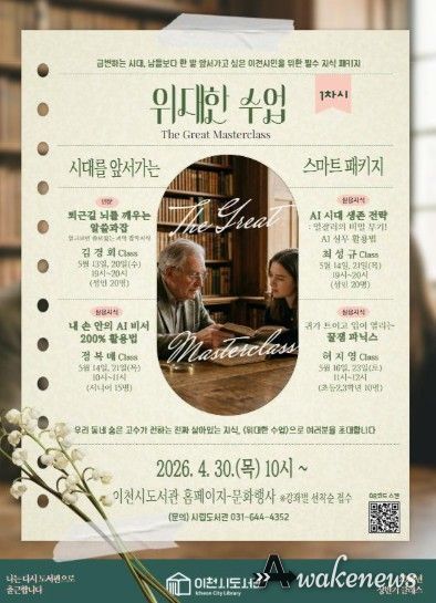 어웨이크뉴스 오경하 기자 | 이천시립도서관은 오는 4월 30일부터 2026년 상반기 시민강사 프로그램 ‘위대한 수업’의 1차 수강생을 모집한다고 밝혔다.