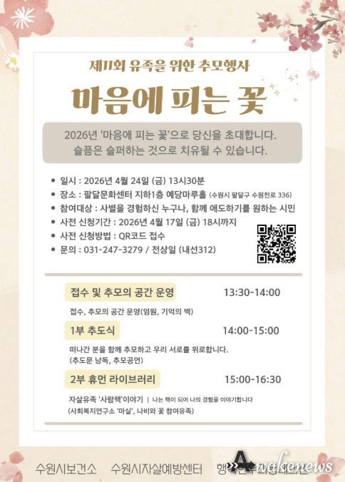 어웨이크뉴스 오경하 기자 | 수원시자살예방센터가 24일 오후 1시 30분 팔달문화센터 예당마루홀에서 유족을 위한 추모행사 ‘제11회 마음에 피는 꽃’을 연다.