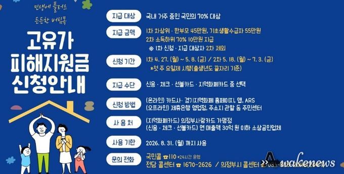 어웨이크뉴스 오경하 기자 | 의정부시는 중동전쟁으로 촉발된 고유가‧고물가로 인한 국민 부담을 경감하고자 ‘고유가 피해지원금’ 신청을 4월 27일부터 접수한다.