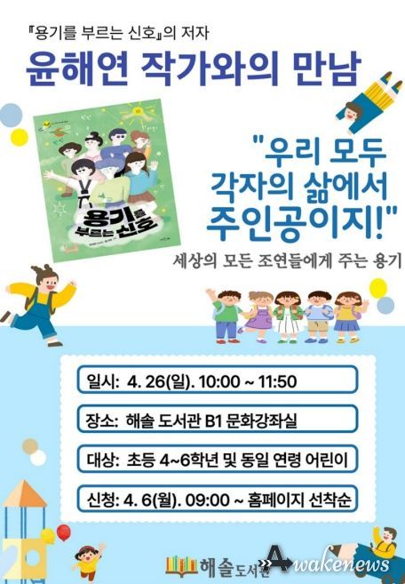 어웨이크뉴스 오경하 기자 | 파주시 해솔도서관은 오는 26일 ‘윤해연 작가와의 만남: 우리 모두 각자의 삶에서 주인공이지’를 진행한다.