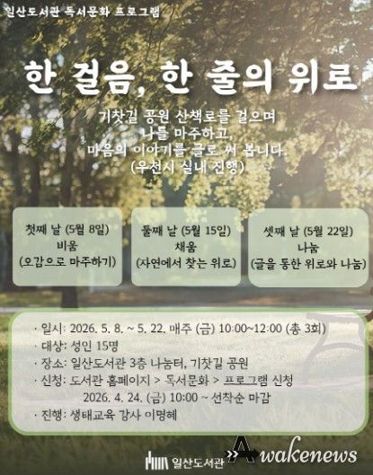 일산도서관 관계자는 “‘한 걸음, 한 줄의 위로’는 자연 속에서 천천히 걷고 글로 자신을 표현하는 과정을 통해 스스로를 돌보고 치유하는 프로그램”이라며, “참여자들이 서로의 이야기를 나누며 공감과 위로를 경험하는 시간이 되길 바란다”고 전했다.