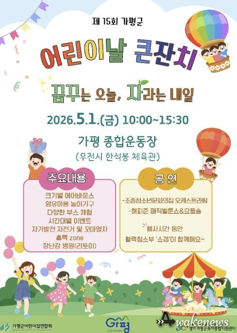 어웨이크뉴스 오경하 기자 | 가평군은 오는 5월 1일 오전 10시 가평종합운동장에서 ‘제15회 가평군 어린이날 기념행사’를 개최한다. 가평군어린이집연합회와 가평군육아종합지원센터가 공동 주관하는 이번 축제는 기념행사와 공연, 놀이, 체험 부스 등 다채로운 프로그램으로 꾸며진다.