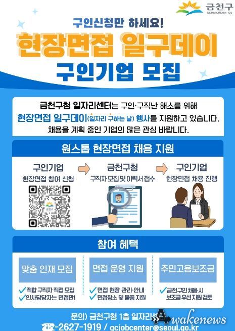 어웨이크뉴스 오경하 기자 | 금천구는 구인·구직난을 해소하고, 기업의 원활한 채용을 지원하기 위해 ‘현장면접 일구데이’ 참여 기업을 상시 모집한다고 밝혔다.