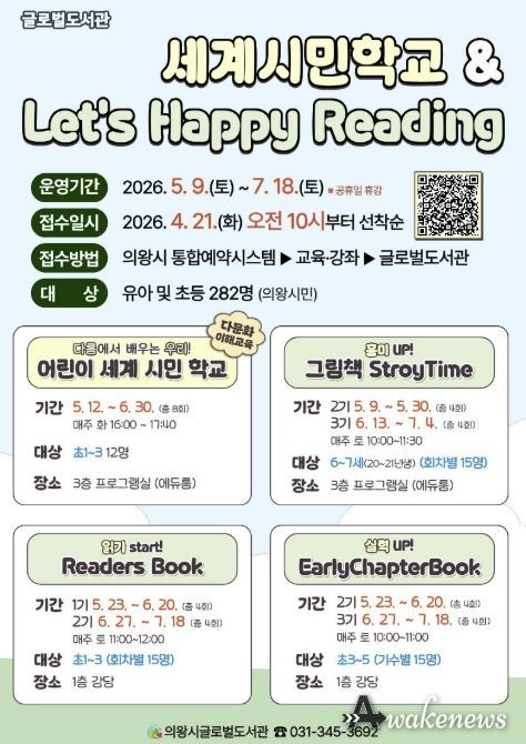 어웨이크뉴스 오경하 기자 | 의왕시 글로벌도서관이 책을 통해 세상을 이해하고 체험하는 다문화 이해 프로그램 '어린이 세계 시민 학교'와 영어 읽기 문해력 향상을 위한 단계별 맞춤 프로그램 'Let’s Happy Reading'의 참여자를 모집한다.