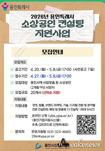 어웨이크뉴스 오경하 기자 | 용인특례시와 용인시산업진흥원은 ‘2026년 용인시 소상공인 창업 및 경영 컨설팅 지원사업’에 참여할 소상공인을 모집한다고 26일 밝혔다.