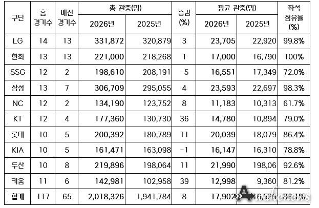 어웨이크뉴스 오경하 기자 | 2026 신한 SOL KBO 리그가 오늘(25일) 열린 잠실, 문학, 광주, 고척, 대전 경기에서 총 9만 9,905명이 입장하며 200만 관중을 달성했다.