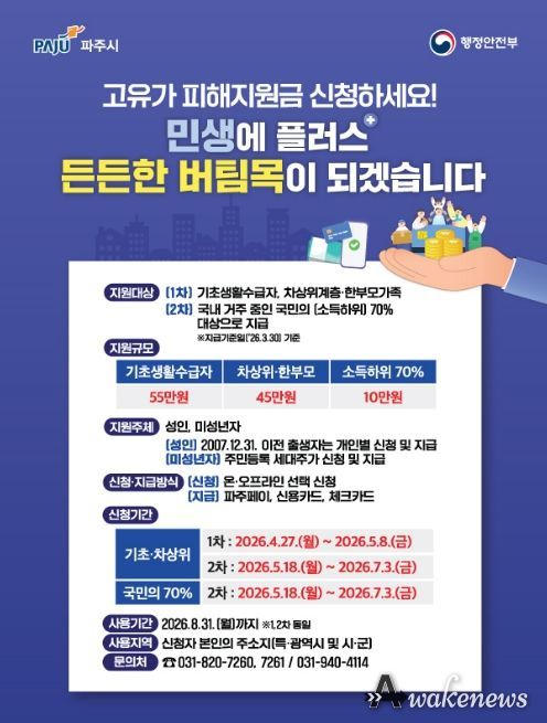 어웨이크뉴스 오경하 기자 | 파주시는 오늘(27일)부터 시민 생활 안정을 위한 정부 추진 ‘고유가 피해지원금’1차 신청을 받는다. 이번 1차 신청 대상은 기초생활수급자, 차상위계층, 한부모가구이며, 신청 기간은 4월 27일부터 5월 8일까지다.