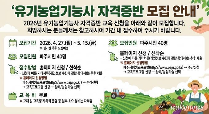 어웨이크뉴스 오경하 기자 | 파주시농업기술센터는 친환경농업 분야 농업 전문 인력 육성을 위한 '2026년 유기농업기능사 자격증 취득’교육생을 4월 27일부터 5월 15일까지 모집한다.