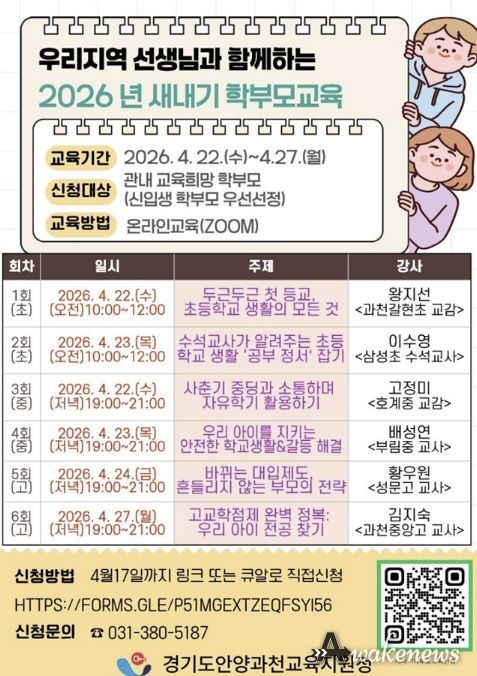 어웨이크뉴스 오경하 기자 | 경기도안양과천교육지원청은 오는 4월 22부터 27일까지 관내 신입생 학부모를 대상으로 ‘우리지역 선생님과 함께하는 2026년 새내기 학부모 교육’을 개최한다.