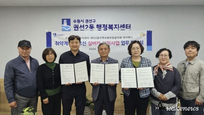 어웨이크뉴스 오경하 기자 | 수원시 권선구 권선2동은 지난 23일, 권선2동 지역사회보장협의체, 케이메디와 취약계층 어르신의 안전한 이동 지원과 삶의 질 향상을 위한 “실버카(보행보조기) 지원사업 업무협약(MOU)”을 체결했다.