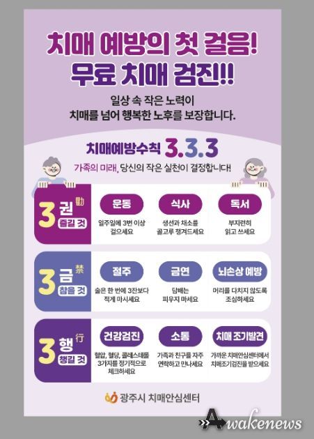 어웨이크뉴스 오경하 기자 | 광주시치매안심센터는 치매 발병 위험이 높은 고령층을 집중 관리하기 위해 오는 29일부터 30일까지 광주시 스포츠헬스센터에서 ‘치매 조기 검진 및 인식 개선 캠페인’을 실시한다고 27일 밝혔다.