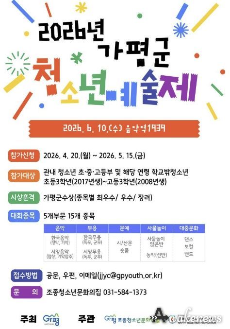 가평군 관계자는 “이번 ‘2026년 가평군청소년예술제’가 청소년들이 자신의 꿈과 재능을 발견하고 성장하는 소중한 기회가 되길 바란다”며 “지역 청소년들이 적극적으로 참여해 예술적 끼와 재능을 마음껏 펼치길 기대한다”고 말했다.
