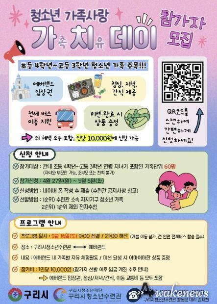 어웨이크뉴스 오경하 기자 | 구리시청소년재단 청소년수련관은 가정의 달을 맞아 오는 5월 16일 관내 청소년 가족을 대상으로 ‘청소년 가족사랑 가치(가족치유)데이’를 운영하며, 참가 가족을 4월 27일부터 5월 5일까지 모집한다고 밝혔다.