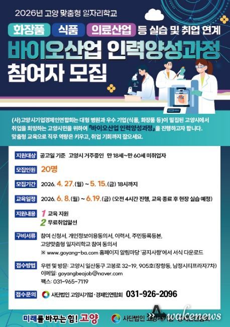 어웨이크뉴스 오경하 기자 | 고양특례시는 2026년 고양맞춤형 일자리학교 공모사업 중 ‘바이오산업 인력 양성과정’의 참여자를 모집한다.