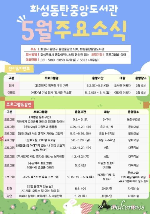어웨이크뉴스 오경하 기자 | 화성동탄중앙도서관이 어린이날과 가정의 달을 맞아 5월 한 달간 도서관 이용자와 시민을 대상으로 자료실과 3층 공공의 마당 등에서 다양한 문화행사를 운영한다.
