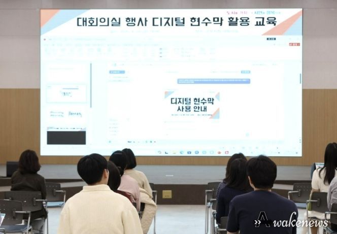 어웨이크뉴스 오경하 기자 | 군포시는 시청 대회의실에서 개최되는 각종 행사와 회의에 기존의 일회성 실물 현수막 대신, 회의실 내 화면을 활용해 현수막 이미지를 송출하는 ‘디지털 현수막’ 방식을 도입하며 친환경 행정과 예산절감에 나서고 있다고 밝혔다.