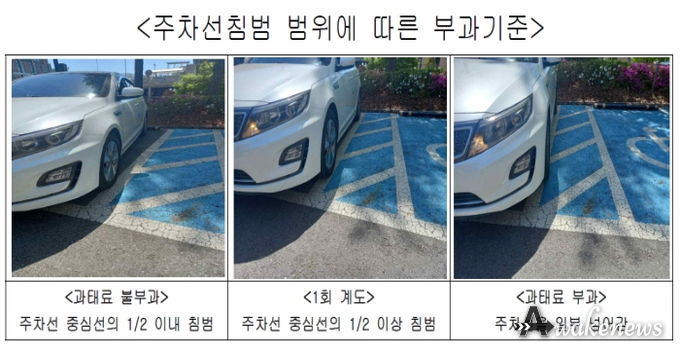 시에 따르면, 차량이 주차선 중심선을 기준으로 절반 이하만 침범한 경우에는 일부가 선에 걸쳐 있더라도 과태료를 부과하지 않는다. 그러나, 중심선을 기준으로 절반 이상 넘어간 경우에는 주차선 침범으로 간주하며, 최초 1회에 한해 계도 조치가 이루어진다. 다만, 차량이 주차구획선을 명확히 넘어 장애인전용주차구역 안으로 일부라도 침범한 경우에는 관련 법령에 따라 10만 원의 과태료를 부과한다.