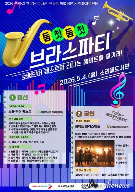 어웨이크뉴스 오경하 기자 | 오산시 소리울도서관은 제104회 어린이날을 앞둔 오는 5월 4일 경기아트센터와 협업해 ‘2026 음악이 흐르는 도서관 콘서트’ 특별공연인 ‘둠칫둠칫 브라스 파티’를 개최한다고 밝혔다.