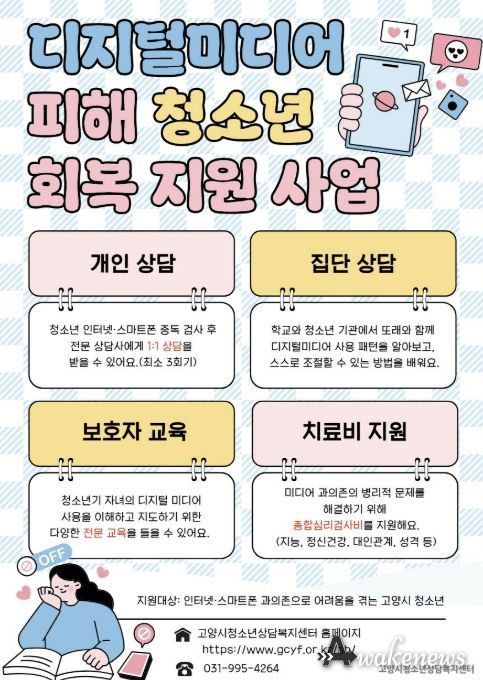 어웨이크뉴스 오경하 기자 | 고양시청소년재단 산하 고양시청소년상담복지센터는 디지털 유해환경에 의한 청소년의 디지털 과의존 및 사이버 도박 등의 사회문제를 예방하고 치료하기 위해 오는 5월부터 12월까지 ‘디지털미디어 피해 청소년 회복 지원 사업’을 운영한다고 밝혔다.