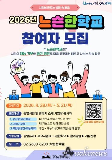 어웨이크뉴스 오경하 기자 | 광명시가 시민이 직접 가르치고 배우는 시민참여형 평생학습 프로그램 ‘느슨한학교’ 신규 운영자를 오는 5월 21일까지 모집한다.