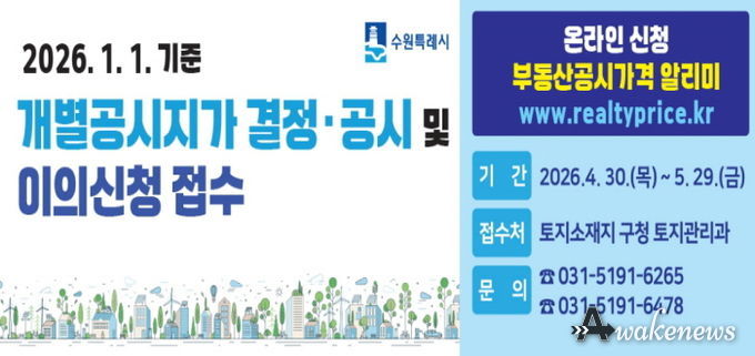 어웨이크뉴스 오경하 기자 | 수원시 권선구는 4월 30일 결정·공시되는 개별공시지가에 대해 4월 30일부터 5월 29일까지 이의신청을 접수한다고 밝혔다.