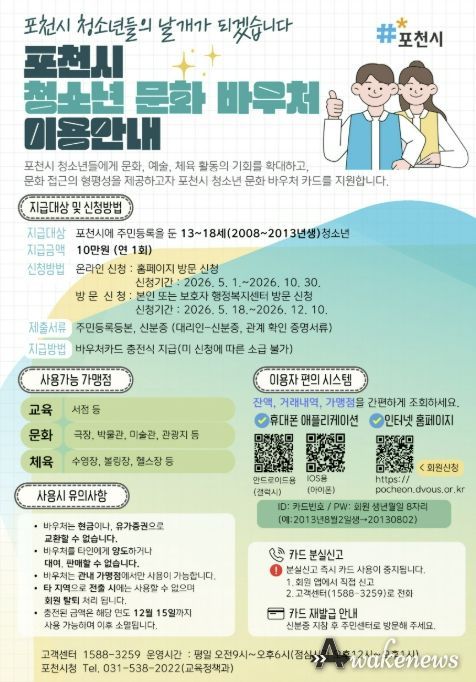어웨이크뉴스 오경하 기자 | 포천시는 청소년의 문화 접근성을 높이고 다양한 체험 기회를 제공하기 위해 ‘포천시 청소년 문화 바우처 지원사업’을 본격 시행한다.