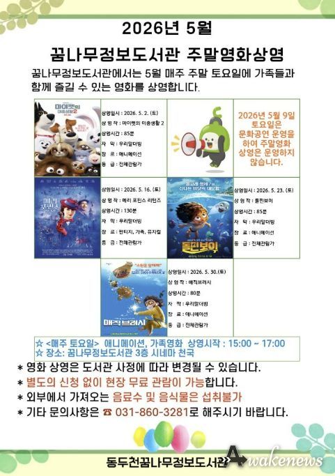 어웨이크뉴스 오경하 기자 | 동두천시 도서문화사업소 정보도서관에서는 오는 5월 매주 토요일 어린이와 가족을 위한 애니매이션 및 가족영화 4편을 상영한다고 밝혔다.