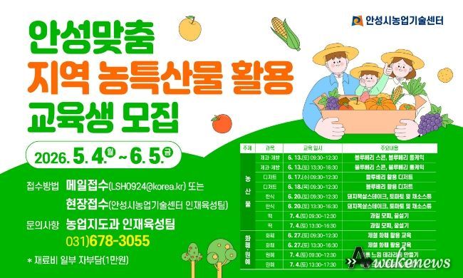 어웨이크뉴스 오경하 기자 | 안성시농업기술센터는 지역 농산물을 활용한 실습 교육을 통해 소비를 촉진하고 ‘지산지소(지역에서 생산된 농산물을 지역에서 소비함)’ 문화를 활성화하고자, 오는 5월 4일부터 6월 5일까지 교육생을 모집한다고 밝혔다.