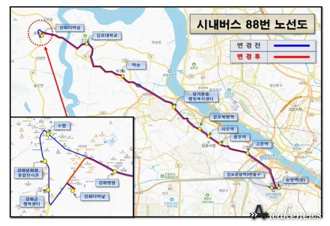 어웨이크뉴스 오경하 기자 | 김포시가 5월 1일부터 시내버스 88번 노선의 강화군 구간을 변경 운행한다고 밝혔다.
