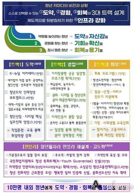 정부는 이러한 문제 인식 하에 2030 청년들의 현장 목소리를 바탕으로 새로운 출발선을 제공하기 위해 이번 「청년뉴딜 추진방안」을 마련했다. 청년들이 자신의 비전과 상황을 고려하여 적합한 프로그램을 선택할 수 있도록 ➊도약, ➋경험, ➌회복이라는 세 가지 트랙을 제시하고, 원활한 구직활동과 채용을 뒷받침하기 위해 ➍정책 인프라도 고도화했다.