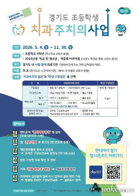 어웨이크뉴스 오경하 기자 | 경기도가 4일부터 초등학교 4학년생 11만명을 대상으로 예방 중심의 구강 관리 서비스를 제공하는 ‘2026년 초등학생 치과주치의 사업’을 시행한다.