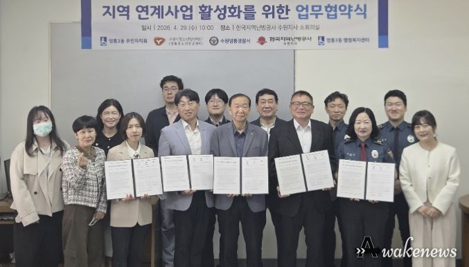 어웨이크뉴스 오경하 기자 | 수원시 영통구 영통3동은 지난 29일, 영통3동 주민자치회가 '영통3동 이야기로 빛나는 느티나무골 육교' 마을리빙랩 사업 추진을 위한 업무협약을 체결했다고 밝혔다.