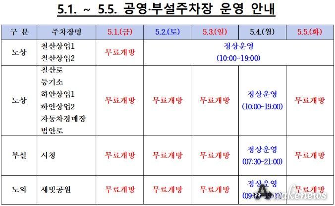 어웨이크뉴스 오경하 기자 | 광명도시공사는 5월 1일 노동절을 맞아 관내 노상 공영주차장을 무료로 개방한다고 밝혔다.