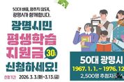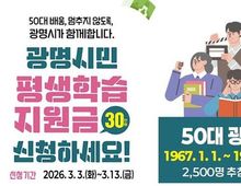 어웨이크뉴스 오경하 기자 | 광명시가 50대 중장년 시민의 배움 기본권 보장을 위해 올해도 평생학습지원금 지원을 이어간다. 시는 오는 3월 3일부터 13일까지 11일간 ‘2026년 광명시민 평생학습지원금’ 신청을 받는다고 26일 밝혔다. 광명시민 평생학습지원금은 생애 전환기를 맞은 50대 시민이 나이·소득·배경과 관계없이 배움을 지속할 수 있도록 생애 1회 1인당 30만 원의 평생학습이용포인트를 지원하는 사업이다. 시민 스스로 자신의 삶과 필요에 맞는 학습을 선택하도록 돕는 것이 핵심 목적이다. 박승원 광명시장은 “배움은 선택이 아닌 누구에게나 보장돼야 할 기본권”이라며 “시민이 나이나 환경의 제약 없이 언제든지 배움을 이어갈 수 있도록 평생학습 기반을 더욱 탄탄히 만들어가겠다”고 밝혔다. 신청 대상은 1967년 1월 1일부터 1976년 12월 31일 사이에 출생한 50대 광명시민이다. 광명시에 1년 이상 계속 거주했거나, 거주기간을 합산해 5년 이상 거주하고 있어야 한다. 시는 총 2천500명을 선정해 지원한다. 59세(1967년생)는 올해가 마지막 지원 대상임을 고려해 우선 선정하고, 1968~1976년생은 무작위 추첨해 대상자를 결정한다. 광명시민 평생
