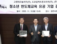 어웨이크뉴스 오경하 기자 | 용인특례시는 10일 시청 접견실에서 ㈜서플러스글로벌과 업무협약(MOU)을 체결하고, 지역 청소년 반도체 교육에 기여한 기업 3곳에 감사패를 수여했다고 11일 밝혔다. 시는 ㈜서플러스글로벌과 ‘청소년 반도체교육 활성화를 위한 업무협약’을 체결하고, 지역 청소년 대상 반도체 진로·직업교육 활성화를 위해 인적·물적 자원을 상호 연계하기로 했다. 협약에 따라 양 기관은 매년 2회 이상 청소년 대상 반도체 현장교육을 정례화하고, 지역 대학과 교육지원청과 연계한 실무형 프로그램을 공동 추진한다. 이상일 시장은 “용인에 안정적으로 자리잡은 ㈜서플러스글로벌이 좋은 일자리 창출은 물론 청소년을 위한 반도체 진로 탐색 교육까지 지원해 주셔서 깊이 감사드린다”며 “이번 협약을 계기로 서플러스글로벌과 함께 청소년들에게 양질의 진로탐색 교육을 제공할 수 있도록 시도 적극 지원하겠다”고 말했다. 김정웅 ㈜서플러스글로벌 대표이사는 “당사의 강점을 살려 학생들이 반도체를 직접 보고 만지며 작동 원리를 현장에서 배울 수 있도록 돕겠다“며 ”용인시에 기반을 둔 기업으로서 지역사회에 기여하겠다는 책임감을