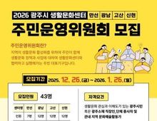 어웨이크뉴스 오경하 기자 | (재)광주시문화재단은 광주시 생활문화센터(만선·광남·고산·신현)에서 2026년에 활동할 주민운영위원회 위원을 통합 공개 모집한다고 밝혔다. 광주시문화재단은 2023년도 만선·광남 생활문화센터를 개관하고 주민운영위원회를 구성하고 운영해 왔다. 이번 모집은 작년 말 임기 만료와 개관으로 인하여 신규 모집이 필요한 광남·고산·신현 센터와 충원이 필요한 만선 센터가 함께 모집한다. 총 43명 구성을 계획하고 있으며, 광남·고산·신현 3개 센터는 각 12명, 만선 센터는 25년도 연임 위원을 제외한 7명을 충원한다. 참여 자격은 공고 모집일 기준 만 19세 이상으로 ▲ 관내 주민등록이 되어 있는 사람 ▲관내 소재 직장인 및 단체 종사자 중 하나에 해당하는 시민은 누구나 신청할 수 있다. 이전에 주민운영위원으로 활동했던 시민도 지원할 수 있으나, 신규 위원을 우선 모집한다. 선정된 위원은 2026년 2월부터 1년간 활동하며 1회 연임할 수 있다. 주민운영위원회는 생활문화센터의 지속 가능한 발전을 도모하기 위해 주민이 직접 생활문화 정책을 제안하고 실행하는 자치 대표기구이다. ‘우리 동네 문화