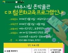 어웨이크뉴스 오경하 기자 | 여주세종문화관광재단 여주시립 폰박물관은 2026년 상반기 디지털 역량 강화를 위한 '디지털문화교육프로그램'수강생을 모집한다. 이번 교육은 급변하는 디지털 환경 속에서 시민들이 일상에서 활용 가능한 실질적인 디지털 기술을 익히고, 창의적 콘텐츠제작 능력을 기를 수 있도록 기획됐다. AI활용부터 스마트폰 기초, 사진, 디지털 디자인, 캘리그라피까지 폭넓은 주제로 구성해 세대별 맞춤 교육을 제공한다. 교육 운영 기간은 2026년 3월 3일부터 6월 19일 까지이며, 수강신청은 2월 12일부터 선착순으로 접수한다. 여주시민을 대상으로 하며 성인과 초등학교 5-6학년 과정으로 나누어 운영된다. ■ 성인 대상 프로그램 (총 14회 과정) ▶ AI 숏폼 제작하기 AI 기초 이해부터 숏폼 콘텐츠 제작 실습까지 진행한다. (3.10.~6.16. 매주 화 13:00~15:00) ▶ 스마트폰 사진교실 – 손안의 기록 스마트폰을 활용한 촬영 기법과 감성 사진 표현을 배운다. (3.10.~6.16. 매주 화 15:30~17:30) ▶ 나만의 디지털 디자인 스토리 with 캔바 캔바를 활용한 디지털 디자